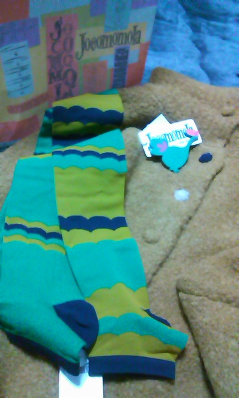 からし色のニットコートと鳥のブローチと派手な股引き